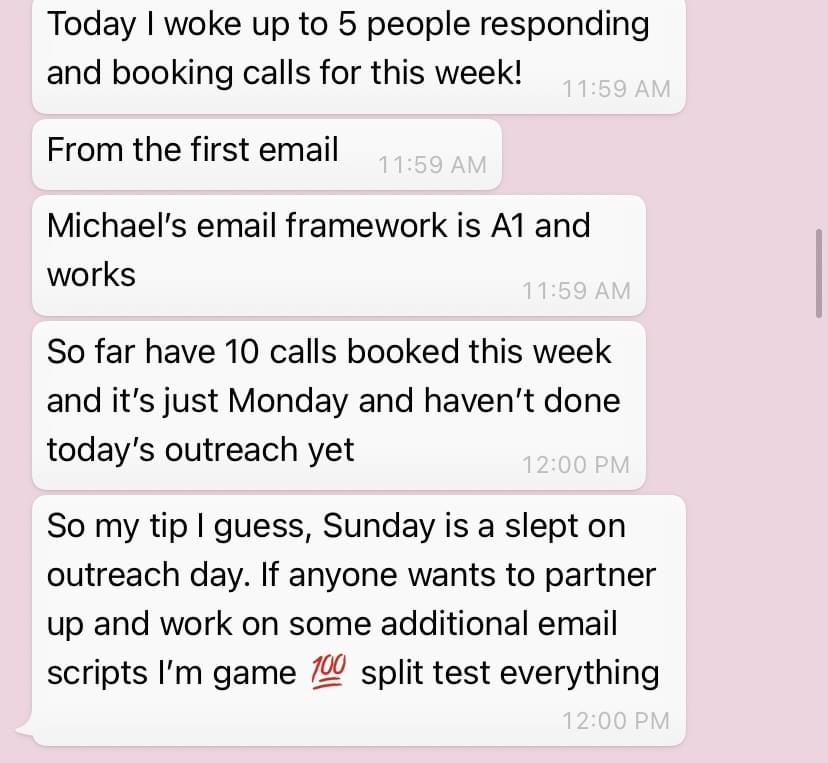 By the end of the cold email training program, youâd have to purposefully self sabotage your cold emails for it not to work... It's pretty hard to mess up.